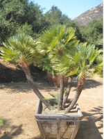 Fan Palm makes a nice accent plant in a shrub border or in a low-growing groundcover. A slightly salt-tolerant palm whose leaf stalks are spiny, Fan Palm may be used as a barrier planted several feet apart or in mass on a large-scale landscape forming a fine-textured accent area.. Growing best in moist rich soil, it is drought and wind resistant, and established plants will survive temperatures to 10 degrees F. or below, in full sun or light shade. Plants grow very slowly in the shade.